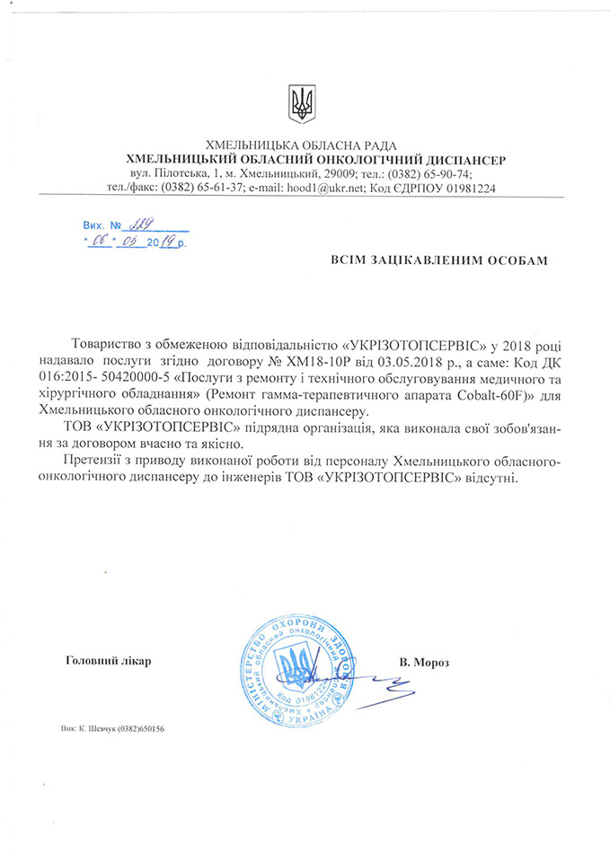 Основним напрямком діяльності Компанії є технічне обслуговування, ремонт, сервіс та модернізація медичної терапевтичної апаратури, створеної для боротьби з онкологічними захворюваннями. УКРІЗОТОПСЕРВІС з 2005 року має досвід обслуговування таких гамма-терапевтичних апаратів: